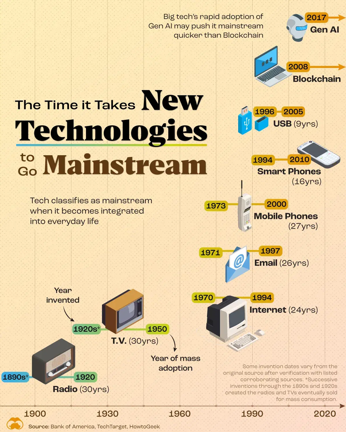 互联网1970 年发明,1994年大规模采用,耗时24年