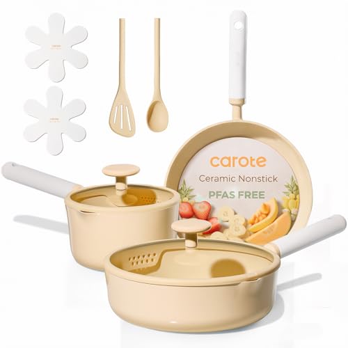CAROTE Ceramic Cookware Set Nonstick, 9pcs Pots and Pans Set Non stick, Non-Toxic & PFAS-Free,Dishwasher, RV/Camping Cookware Set,Sauce Pan with Lid, Yellow